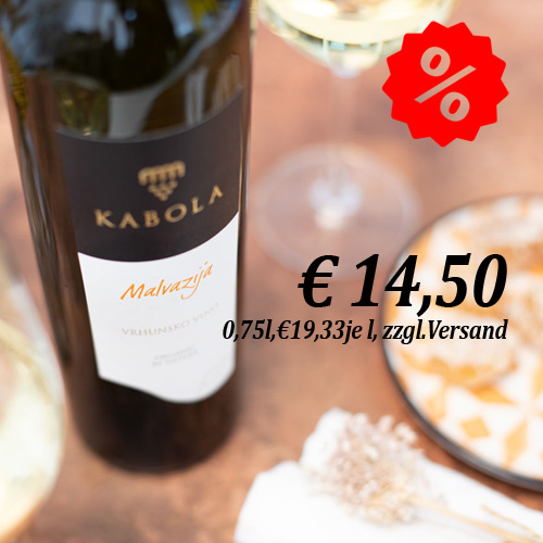 Kabolas Malvazija hat eine schöne grünlich-gelbe Farbe, er ist kristallklar und hat einen mittleren Körper. Die Nase öffnet sich mit Akazienblüten, Noten von frischen Äpfeln, Limettenschalen und Minzblättern. Der Wein ist trocken, teilweise warm und weich, wobei er eine raffinierte Frische, eine angenehme Mineralität und einen mittleren Körper beibehält. Er ist außergewöhnlich ausgewogen, hat einen intensiven Geschmack und einen schönen Abgang. Der Wein ist geschmackvoll, harmonisch und sehr trinkbar, mit Noten von Pfirsich im Nachgeschmack.